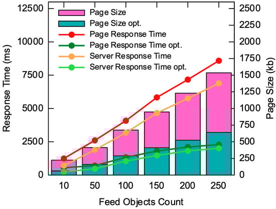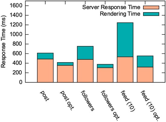 In the graph in Figure 7, the entire bar represents the page loading time (or DOM time). It is divided into two parts—the Server Response Time, defined as the time from the start of a request until the application server has finalized and sent its response, and the Rendering time, which is the difference between the DOM time and the server response time. As is the case with the other optimizations, the effect is most pronounced, having the most data and page element intensive endpoint out of the three, that is, Feed (10). Among notable things, not only has the server response time decreased sharply, the Rendering time appears to also have fallen, which is due to the JSON payload (used in the optimized version of the application) taking less space and thus travelling faster through the network. The browser also does not need to spend a lot of time parsing a heavy HTML, and this process is overall faster because JavaScript DOM manipulation capabilities are used instead.