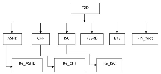 Logic structure of a prediction model. Abbreviation: T2D, type 2 diabetes; ASHD, arteriosclerotic heart disease; CHF, chronic heart failure; EYE, retinopathy; FESRD, first-time renal failure; FIN_FOOT, amputation; ISC, ischemic stroke.