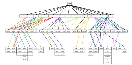 Diabetes progression was characterised by changes in a patient’s disease status in terms of the number of complications that they developed. The number implies the occurrence of one event that may also preclude the development of another, thus, the major diabetes progression status of this study includes T2D-associated complications, all-cause of death, and staying in the same disease state while considering the competing risk events. Prognostic models with competing risks have been discussed in various studies [22,23,24,25]. To tackle the interaction among health states, we analysed the development of these competing risk events within a single mathematical analytic framework instead of treating each complication in isolation, which enables us to determine whether one event is more likely to occur than another. A tree-like structure of patients’ disease progression was set up as shown in Figure 2, consisting of 62 risk equations representing important pathways after diabetes has been diagnosed.