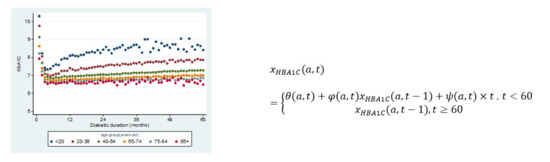 Note that is calculated with and , where is chosen from the corresponding values in Table A3 and is chosen from the corresponding value in Table 2. Similarly, is computed with the associated glycated haemoglobin (HbA1c) function, which is defined by