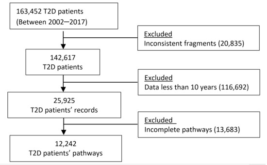 Process of identifying eligible patients’ pathways in analysis. Abbreviation: T2D, type 2 diabetes mellitus.