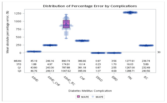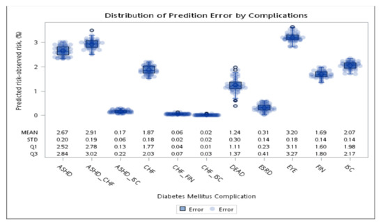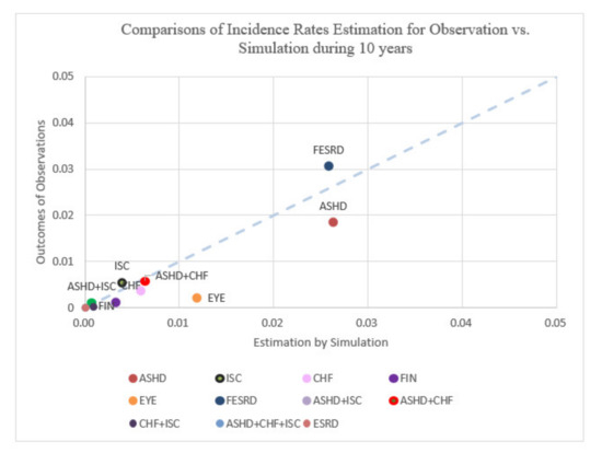 - The distribution of prediction error by complications and death rate is shown in Figure 8 and Figure 9. The error ranges between the overall simulation results, and the actual observations were within 5% of the predicted value of complication and death rate and the observation quality. Suppose the average absolute percentage error was used for evaluation, and only 5 out of 10,000 events included. In that case, ASHD, death, and ESRD are within the generally accepted 30% range. Moderate complications are the incidence of stroke and CHF, with the incidence of foot lesions being highly overestimated.