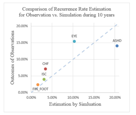 - A comparison of the simulated incidence rates of the first complication and overall deaths with observations in 10 years is presented in Figure 6. From the observational data, the prediction gap of FESRD was the smallest, e.g., underestimated 0.3%, and the prediction gap of retinopathy the largest, e.g., overestimated by 3.2%. Most of the predicted complication rates were higher than the actual rates, with gaps of 1.30% for death, 2.60% for ASHD, 3.20% for retinopathy, and 2.90% for ASHD + CHF, 2.00% difference in infarct stroke, 1.80% difference in CHF, 1.70% difference in diabetic amputation, 0.00% difference in CHF + infarct stroke, 0.10% difference in CHF + diabetic amputation. The difference between atherosclerosis heart disease + infarct stroke was 0.20%. A similar accuracy is shown when further applying it to predict recurrent complications (Figure 7).