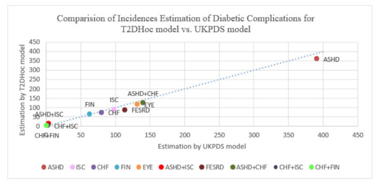 Comparison of incidence rates estimation of diabetic complications for UKPDS vs. T2DHoc models with 3867 hypothetical patients in 10 years. Abbreviation: ASHD, arteriosclerotic heart disease; CHF, chronic heart failure; T2D, type 2 diabetes mellitus; EYE, retinopathy; FESRD, first-time renal failure; FIN_FOOT, amputation; ISC, ischemic stroke.