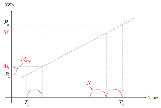 In Figure 2, the X-axes and Y-axes represent the time axis and accumulated power usage, respectively. M denotes the missing data and N represents the number of the missing data intervals; accordingly, . represents the average power usage for each missing interval.
