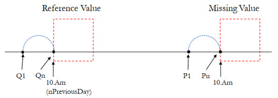 Unlike other types of data, power consumption data characteristically have inertia. This means that data at a specific point in time are substantially similar to data at a close time point in the past, and they are highly affected. For example, at a typical home, people go to work in the morning and return at night on weekdays. Hence, the power consumption patterns are similar according to time. Based on this idea, this method adopts a similar power consumption pattern of the past to correct the missing data. The most common method adopted when measuring similarity involves calculating the Euclidean distance [32,33].