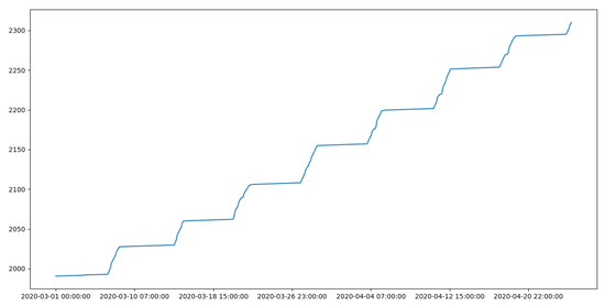 As a power consumption feature, the values in the power consumption data continuously trend upward, as illustrated in Figure 4. Therefore, the interval usage for each hour is calculated using the difference via preprocessing. For example, if the accumulated usage is 950 kWh at 9:00 and 1000 kWh at 10:00, the interval usage at 10:00 is 50 kWh. Preprocessing is performed to calculate the interval usage of all selected target customers, and save it in a separate column.