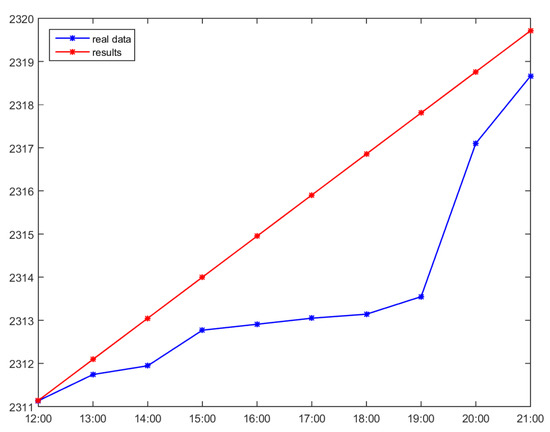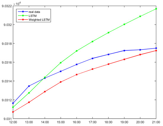 Finally, the final interval usage at 12:00 was added to the accumulated power usage, at the time (11:00) before the start of the missing interval, to correct the accumulated power usage (Weighted LSTM Estimated) at 12:00. Next, the estimated value at 13:00 was added to the corrected data of 12:00 to correct the data at 13:00. Accordingly, the data in the missing intervals were sequentially corrected. Figure 13 compares the real data and the data corrected by applying the weight to the data estimated via the LSTM. It is evident that the results are significantly better than the data corrected via the LSTM estimation.