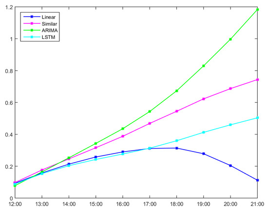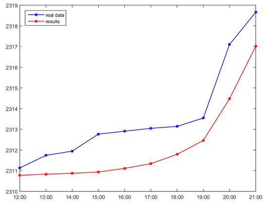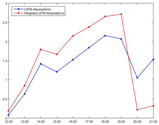 Figure 18 presents errors starting from 14:00; according to Figure 18, the data produced by the LSTM estimation-based compensation method are larger than the real data. However, in the LSTM estimate and weight-applied compensation method, the results obtained are never larger than the real data, and the error approaches zero at the ending time of the missing data interval.