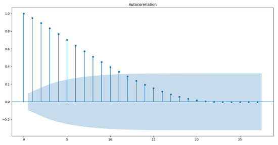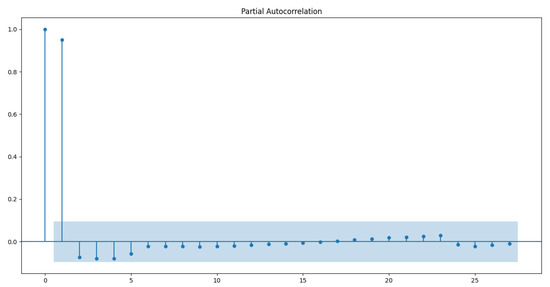 The results of the partial autocorrelation function (PACF) exhibit a cut shape after the second, as illustrated in Figure 8. Therefore, we set the p value of the AR model to “2”.
