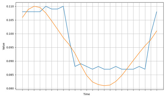 The 24-h data were estimated and compared with the real data. The mean absolute error (MAE) was 0.0056. The number of CNN filters was set to 120, while the number of neurons in the LSTM model was set to 30. Then, they were combined with dense layers, for which the numbers were set to 30, 10, and 1, respectively, to create the model. The number of epochs was set to 20. A total of 713 was trained, and approximately 30 min was required to estimate the result.