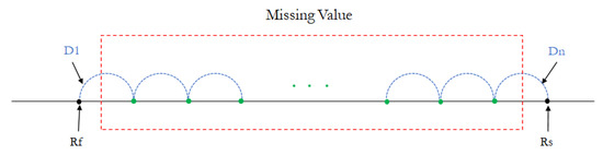 Figure 12 shows the concept of missing data intervals. The procedure of the LSTM estimate and weight-applied compensation method is presented as follows. First, the usage in the missing data interval is estimated via the LSTM estimation. Second, a weight is applied to the estimation result to recalculate the interval usage. Third, the weight-applied interval usage is added to the previous accumulated usage before the occurrence of the missing data. Then, the second weight-applied interval usage is added to the first corrected missing data to correct the second missing data. Accordingly, all data in the missing intervals are corrected. The following equation applies a weight to the interval usage () estimated via the LSTM estimation to recalculate the interval usage.
