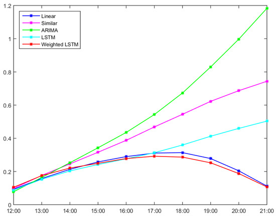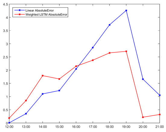 Figure 16 presents a graph that compares the errors between the cases of adopting the LSTM estimate and weight-applied compensation method and the linear interpolation method. The linear interpolation method exhibits the largest error at 19:00; however, the LSTM estimate and weight-applied compensation method exhibits significantly mitigated errors in the middle part.