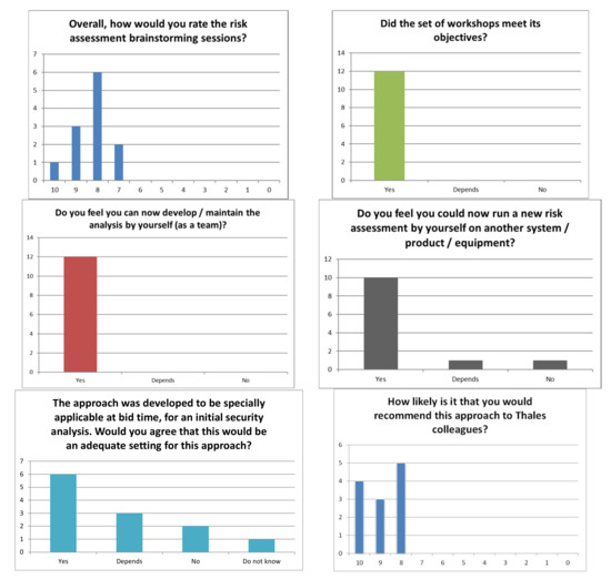 However, training on a predefined case study provides little variety in terms of business constraints and mixes educational concerns with efficiency concerns. So, in parallel to training, running risk assessments with the posters on many small Thales industrial projects (cf. middle part of Table 1) provided us with a much richer set of operational constraints. For example, some projects had a very rich set of already deployed security measures that needed to be accounted for. Some projects had detailed architecture schemas readily available, while other projects related to futuristic ideas, with a completely undefined or speculative architecture. Some projects could be handled with two persons during the brainstorming sessions, while other projects required up to twelve persons to provide a good domain knowledge coverage. However, all these projects had a common point: participants of these use cases had never run a risk assessment before. In less than two days (i.e., 5 to 7 two-hour workshops), the objective was to effectively run the risk assessment and bring the participants to a sufficient level of cybersecurity maturity to allow them to be independent. Each project proved to be an opportunity to fine-tune the posters to the project’s operational constraints. Data were essentially collected through observation. Nonetheless, after some sessions, explicit surveys were also run, with the following 10 questions: