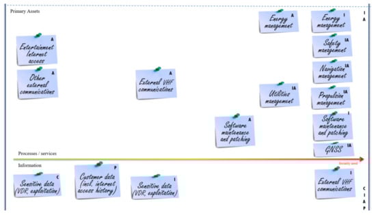 In the context of our study, we have identified several business assets. Some are considered processes such as energy management, safety management, navigation management, propulsion management, software maintenance and patching, entertainment internet access. Others are considered as informational assets: external VHF communications, customer data and other sensitive data, such as the Voyage Data Records (VDR).