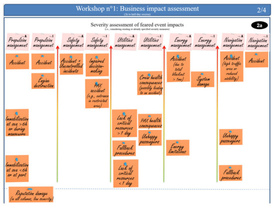 As shown in Figure 3, we have previously identified and ranked key assets in terms of security needs. Here, we analysed how well these needs must be complied with, i.e., the assurance with which the security needs must be designed and implemented. In our case, we focused on the ten most important assets defined, which enabled us to identify about twenty or so feared events, with half a dozen impacts each. For example, propulsion management has two security needs: availability “A” and integrity “I”. By adding the negation symbol, we derived two feared events: unavailability of propulsion management “¬A” and alteration of propulsion management “¬I”. Thereafter, we have identified that the feared event affecting the availability of propulsion management leads to four impacts. The first one, which is an accident, was judged most critical. A second one, which is an immobilization on the open sea for a duration above 6 h or during a manoeuvre, was rated with an average severity. Additionally, two other impacts were rated low in terms of BIL: immobilization on the open sea for a duration below 6 h and reputational damage.