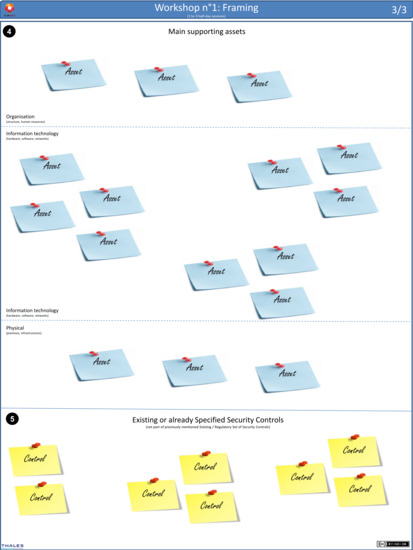 The third and last standard Obérisk datasheet for workshop n°1 (cf. Figure 6) is the continuation of the first sheet. It is again called Framing and security baseline. It is split in two sections, numbered four and five. Section four allows documenting the supporting assets, represented by light blue sticky notes, such as the business assets. The supporting assets are organized into three groups: