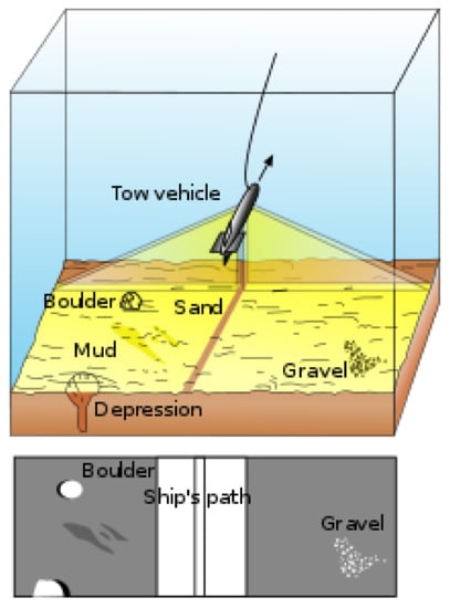 Side-scan sonar systems consist of a dual-channel tow-fish device capable of operating in water depths for the survey and contain a tracking system [,]. The device is usually towed from a surface vessel or submarine, or mounted on the ship’s hull (Figure 1).