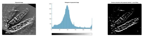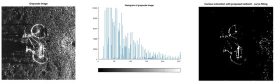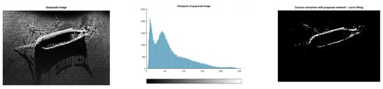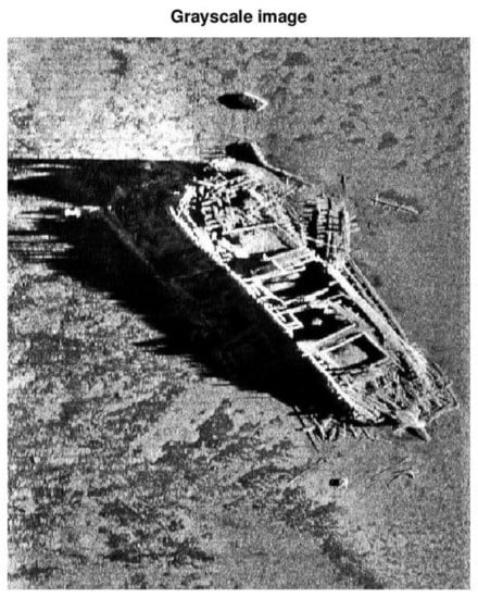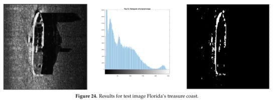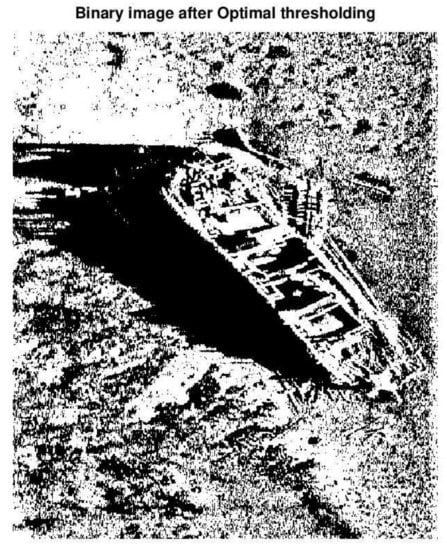 This research deals with the problem of the detection of man-made objects detected in side-scan sonar images. Man-made objects tend to have regular shapes which can be identified by obtaining their contour []. The most common process for separating an image into regions or their contours corresponding to objects is segmentation. Contours are obtained by identifying differences between regions (edges). Since the simplest property which pixels in a region can share is intensity, the simplest method for image segmentation is thresholding [,]. Thresholding is an important technique in image segmentation, enhancement, and object detection. Thresholding creates binary images (pixel values 0 or 1) from grayscale images (pixel values from 0 to 255) by turning all pixels below some threshold to zero (i.e., black) and all pixels above that threshold to one [,,,].