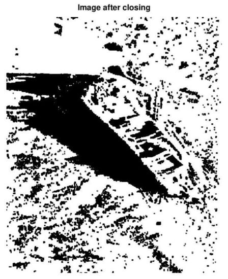 Figure 8 presents the result of corrosion expansion (closing) for the binary image obtained after Otsu thresholding. The result is bad because the shadow and the background noise remain, so the object contour is not clear. Figure 9 presents the result of the corrosion expansion algorithm of the Kirsch edge detection filter [,]. There is some improvement but still, the target is not clear while much of the noise remains.