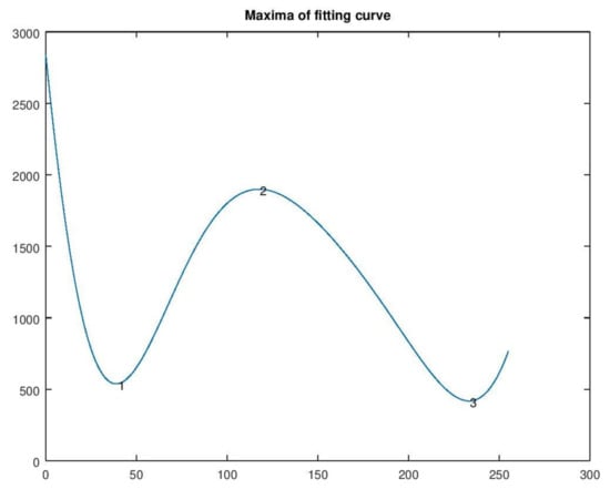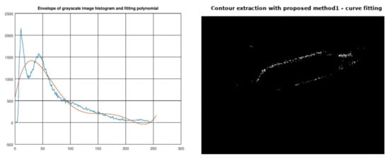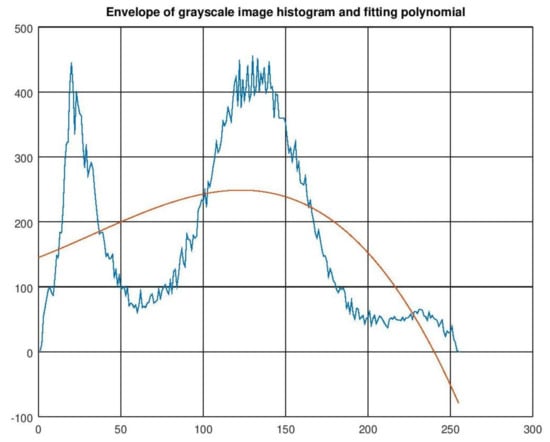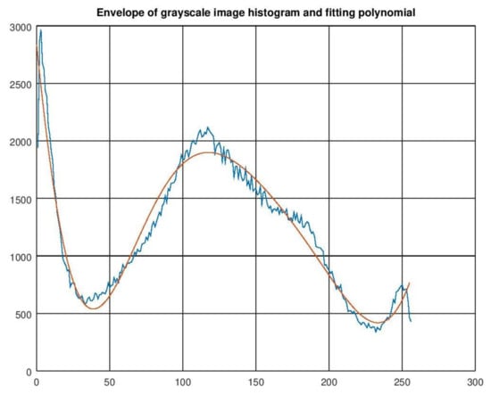 The performance of method 1 (curve-fitting) is affected by the degree of the fitting polynomial, n. In our experiments we have successfully tested polynomial degrees from n = 4 to n = 20; n = 6 works fine with all test images. The reason is that typically tri-modal SSS image histograms have three peaks and three (or two) valleys (see Figure 11 and Figure 21, Figure 22, Figure 23, Figure 24 and Figure 25). Intuitively, they can be approximated by a polynomial of degree n = 6. In other words, n = 6 produces a curve flexible enough to fit nicely to tri-modal histograms. Degrees lower than 4 fail to faithfully follow the histogram envelope and may sometimes miss the local minima just before the rightmost mode. Such a case is demonstrated in Figure 26 for the test image boat with n = 3.