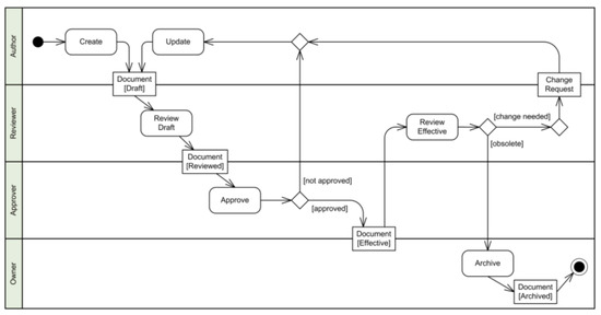 The diagram commonly used in UML to model processes is the activity diagram. Figure 4 (https://www.uml-diagrams.org/document-management-uml-activity-diagram-example.html, Accessed Date: 15 December 2020) illustrates an example of document management process activity.