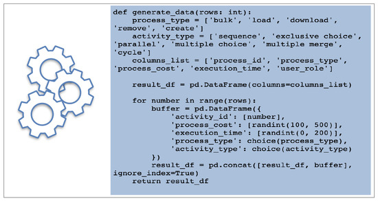 After exploring the metrics, we assumed the following types for process type data: bulk; load; download; remove; and create. For activity types, we considered the following: multiple merge; multiple choice; parallel; exclusive choice; sequence; and cycle. Finally, we defined the following characteristics for process features: process id; process type; process cost; execution time; and user role. These are the steps followed: