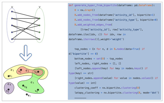 The reason for this is to have a more convenient basis to form a hypergraph itself from the obtained bipartite graph, which will be more convenient to form a hypergraph itself from the obtained bipartite graph. In this context, we relied on two dedicated functions. We first handled the input (previously generated data) and created a bipartite graph; then, we cast the bipartite graph into a hypergraph.