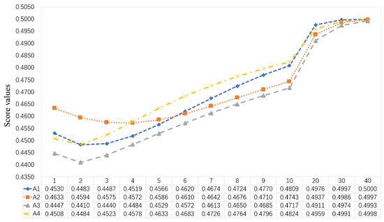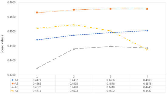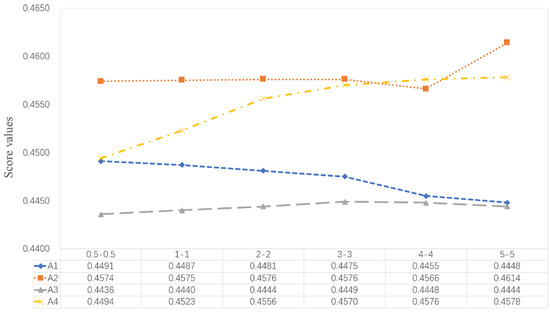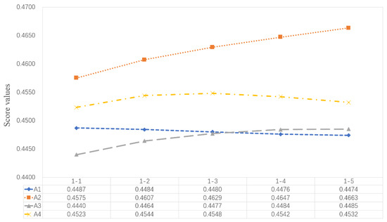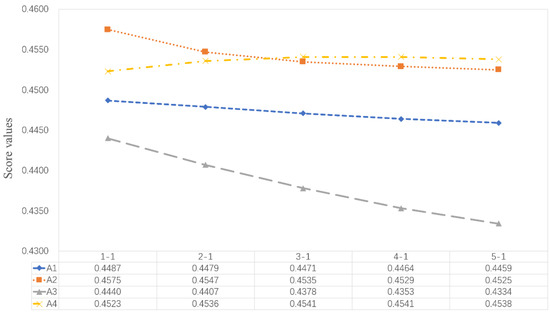 First, we assume to be a constant () and investigate how the parameter affects the decision results. In Figure 3, we discover that when the value increases, the score values of and also increase. In addition, the score values of decreases. The change in score values of is special. With the increase in value , the score value of increases at the beginning and decreases soon afterwards. Moreover, different values of lead to different score values and ranking orders of alternatives. Nevertheless, the optimal alternative is always .