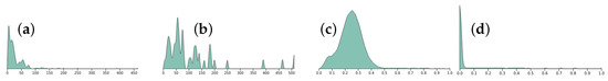 Kernel density estimate plots of the German graph, showing the minimum number of songs (a), the maximum number of songs, (b) the edge weights after min–max normalization with Box–Cox Transformation (c) and without (d).