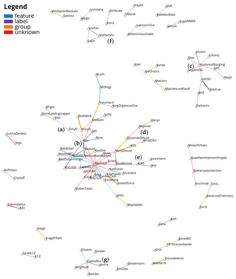 Use Case A sub-graph of the German corpus can be seen in Figure 2, showing different clusters. The nodes at position (a) show previous members of the German label “Aggro Berlin” and the rap crew “Die Sekte” such as Sido, TonyD, and BTight. At position (b), previous members of “Ersguterjunge” and “Berlins Most Wanted” can be seen such as Bushido, Fler, Kay One, Eko Fresh, Nyze, M.O.030, and Baba Saad. Above these artists, more Berlin-based artists such as Prinz Pi can be seen. Another interesting thing to notice is that Eko Fresh is connected to a large number of artists, showing his influence on the German rap scene through collaborations and supporting new artists. Position (c) shows Hustensaft Jüngling and other artists that he collaborated with. Some of the edges were created because of the exhaustive use of brand names such as Gucci or Fendi, or drugs such as Lean. At position (d), the Hamburg-based group’s Beginner and ASD, with some of their members, can be seen. Positions (e) and (f) show Frankfurt-based artists such as AZAD, Jonesmann and Jeyz, and Haftbefehl with his brother Capo and label member Soufian. Label members and feature partners of Capital Bra can be seen at position (g). Besides these examples, multiple “part-of” and feature relations can be found.