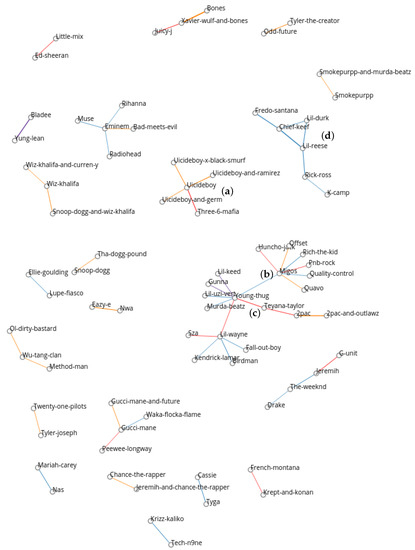 An excerpt of the similarity network of English rap artists based on the most similar lines in their lyrics. Collaboration partners tend to be connected. (a) $uicidebo$ and Three 6 Mafia, (b) Migos and two of their members with feature partners, (c) artists that collaborated with Young Thug or were signed by his label, and (d) multiple artists from Chicago and associated with the genre Drill.