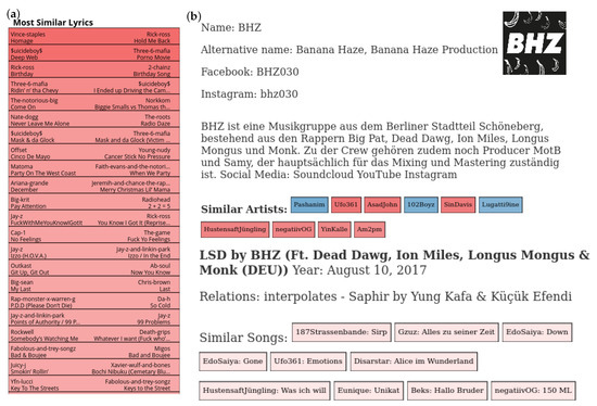 The most similar English songs (a) and the artist profile of the German rap group BHZ (b).