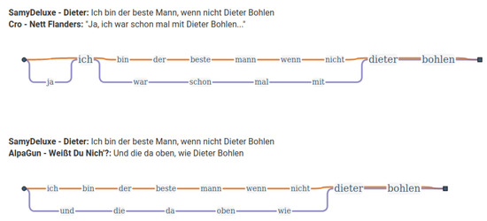 Examples for the monolingual alignments of two songs can be seen in Figure 7. Figure 7 a shows “Kool Savas - Komm mit mir” and “Alligatoah-Komm mit uns”, where Alligatoah parodies the original song by Kool Savas. The excerpt in Figure 7b shows “Sido-Du bist Scheiße” and “Tic Tac Toe-Ich find dich scheiße”, where the song by Sido sampled the original by Tic Tac Toe.