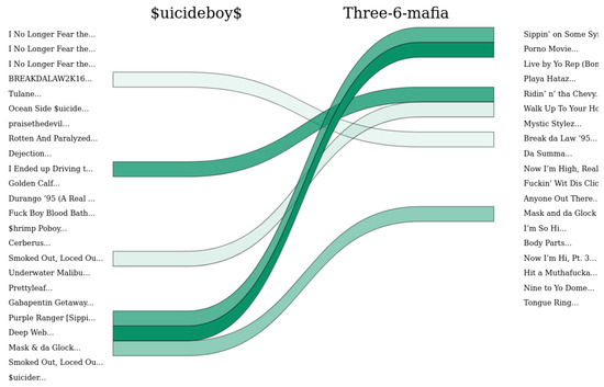 Use CaseFigure 6 shows an example of the song similarities of two artists. In this case, the songs of the $uicideboy$ and Three 6 Mafia are displayed side-by-side. Some of these pairs can be found in Figure 4a and are part of a lawsuit that was filed by Three 6 Mafia against $uicideboy$ [56]. For these songs, samples, or lines that are part of the hook were reused.