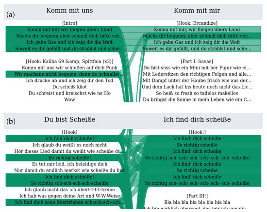 Monolingual alignments on the line level of the songs “Kool Savas-Komm mit mir” and “Alligatoah-Komm mit uns” (a), and “Sido-Du bist Scheiße” and “Tic Tac Toe-Ich find dich scheiße” (b).