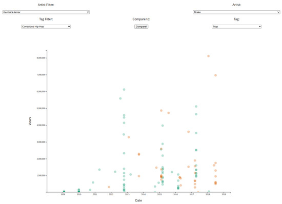 The scatterplot compares Kendrick Lamar’s conscious hip-hop tracks with Drake’s trap songs from 2009 to 2019 in terms of views and release date.