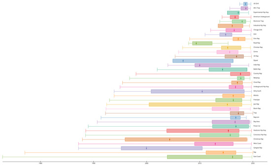 A timeline visualizing all rap genres associated in the Genius Expertise dataset. Each genre is shown as a boxplot.