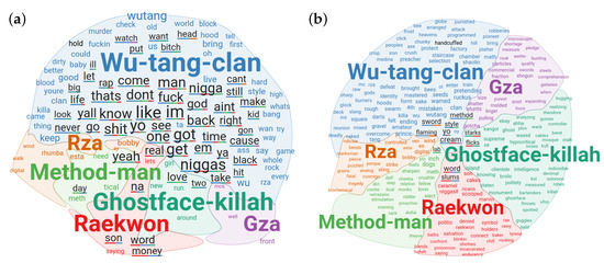 TagPie showing the most frequent used words by the Wu Tang Clan and various members (a). TagPie (b) shows words by z-score, e.g., words that are more frequent than the rest of the corpus.