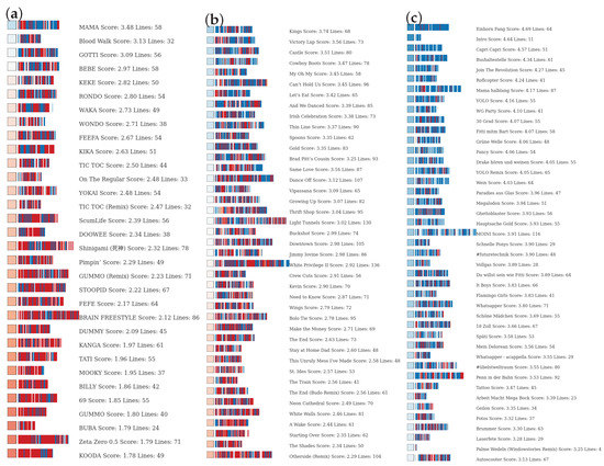 Sentiment Barcodes for the songs of 6ix9ine (a), Macklemore and Ryan Lewis (b), and MCFitti (c). A red bar indicates a negative sentiment, and a blue indicates a positive sentiment for a line.