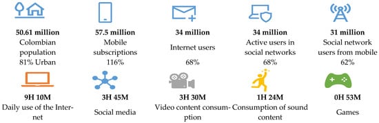- Hootsuite. Digital 2020 Colombia. 2020. Available online: https://datareportal.com/reports/digital-2020-colombia (accessed on 2 December 2021).