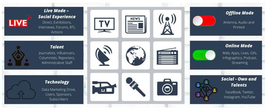 The media–user digital socialization [60] makes use of new channels [61] to revitalize the connection of the media—press, radio and television—with its audience; 5-month follow-up—January, February, March, April and May—that shows the operational strategy of the Colombian media industry in the social isolation phase. The balance of the ecosystem that establishes a model of attraction and participation in the multiplicity of offers that attack the user’s attention from the development of the Internet and mobile devices that bring with them the convergence of five key factors in the digital environment [62]: media industry, technological context, content, professionals and users.