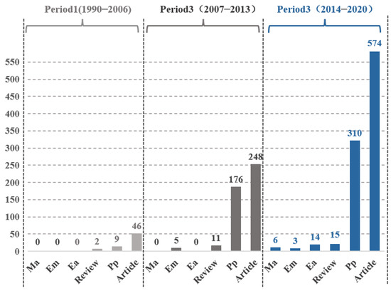 As shown in Figure 1, the analysis of the six literature types at different time periods shows that the number of publications of all literature types was low before 2004, and began to increase gradually after 2004, showing a stable development from 2015 to 2020. Article and Proceedings Paper have always been the most frequent literature types.