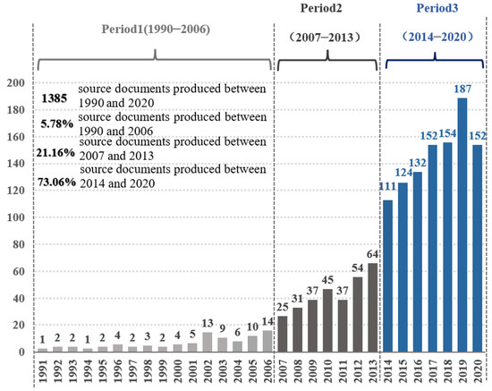 The number of papers related to the field of NPO research retrieved from the WOS core database is 1385 (1990–2020), and the distribution of the number of papers and the 3 stages of development can be seen in the Figure 3.
