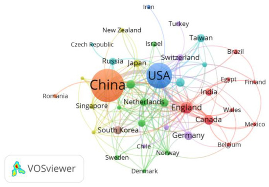 The top four countries in terms of article publication were China, the United States, the United Kingdom, and Canada. As shown in Figure 4 we have conducted a comparative analysis of the distribution pattern of articles in each country over time. The top four countries show an increase in literature publication, with the UK and Canada showing a similar number of publications and growth rates. Compared with these two countries, the United States showed a greater growth rate, while China did not until 2007. However, since 2009, China has surpassed the US in terms of the number of publications.