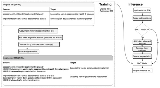Finally, the NMT model is trained using the combination of the original TM, which consists of the original source/target sentence pairs and the augmented TM, consisting of augmented-source/target sentence pairs . At inference, each source sentence is augmented using the same method. If no FMs are found with a match score above , the non-augmented (i.e., original) source sentence is used as input. Figure 1, which is modified from Tezcan, Bulté and Vanroy [4], illustrates the NFR method for training and inference.