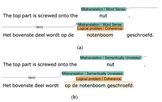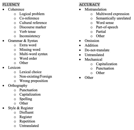 Even though all above-mentioned methods are useful for assessing MT quality for different purposes, they all fail to capture the exact nature of the errors made by an MT system and to provide reasons for a given quality assessment. For this reason, error analysis, which consists of detecting, categorizing and marking errors in machine-translated text, has emerged as a crucial human quality assessment technique, especially when it comes to identifying specific translation issues and carrying out diagnostic and comparative evaluations of translations [60,61]. A variety of MT error taxonomies has been proposed in the literature. They can be grouped as follows: (a) taxonomies that use common error categories as a basis, such as omissions, word order errors, incorrect words, unknown words and punctuation errors [61,62]; (b) linguistically-motivated taxonomies, which classify the MT errors into different linguistic levels, such as the orthographic, lexical and semantic levels [63,64]; and (c) fine-grained, hierarchical error taxonomies, that take the distinction between accuracy (or adequacy) and fluency as a basis for translation error classification [65,66].