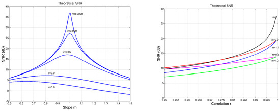 (Left panel): Signal-to-noise ratio (SNR) as a function of line slope for fixed values of the correlation coefficient . (Right panel): Signal-to-noise ratio (SNR) as a function of correlation coefficient , for fixed values of the line slope .