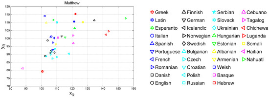 Because it is cumbersome to consider all New Testament texts studied in [1] to assess whether, within a language, the mathematical mutual relationships of the original Greek texts are saved or lost, in the following we use only Matthew as reference text in any language. From the large spread shown in Figure 1, we can imagine the even large spread likely found in studying all langauges, a topic, however, deeply studied in [1].
