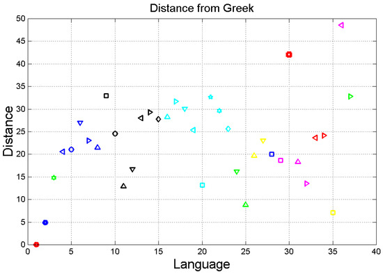 Table 1 reports the average values of , , , found in Matthew in the indicated languages. Figure 2 shows the vector plane reporting and of Equation (13), and Figure 3 shows the distance of a translation from the Greek Matthew (, for each language. Latin, as it was found in [1], is the translation closest to the original Greek. From these figures we can see that all translations are mathematically quite diverse from the original Greek text and show a large variability, as in [1]. Similar results can be found for other New Testament texts, here not considered for brevity.